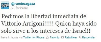 No me extraña que algunos miembros del gobierno israelí intentaran aprobar una ley para cortar los fondos de todas esas ONG’s que se instalan en Israel para «trabajar por la paz». Estuve en contra de esa ley y lo sigo estando. Sí. Pero iniciativas como esta se van a seguir repitiendo si la actitud de los cooperantes extranjeros sigue en esta línea. Pensemos en lo que le pasó a un compatriota de mi interlocutora, Vittorio Arrigoni, asesinado por salafistas. ¿Qué hizo la organización Rumbo a Gaza en su cuenta de Twitter? Esto que -intento no poner las tripas sobre este post- mueve a las nauseas: